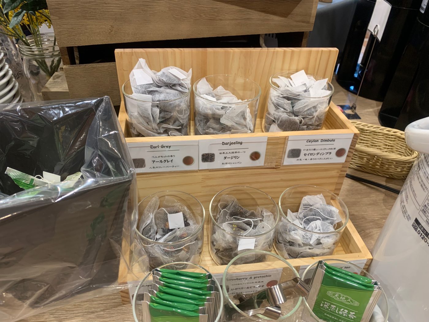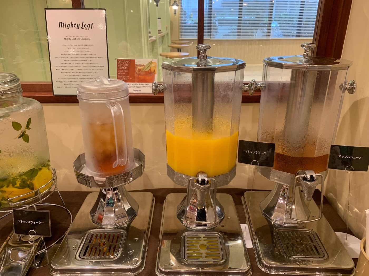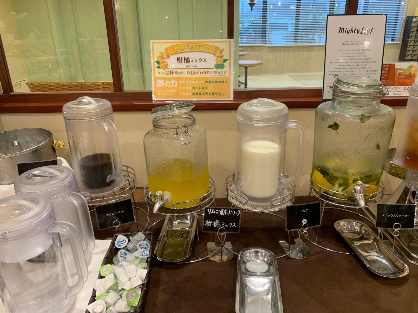 紅茶、コーヒー、ミルク、リンゴ酢ドリンク(柑橘ミックス)、デトックスウォーター(マイティーリーフティーカンパニー)などなど種類豊富で何から飲むか迷ってしまします!