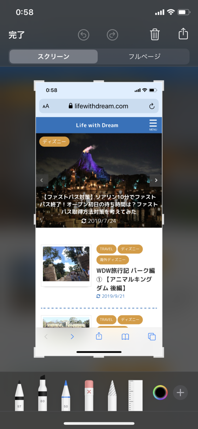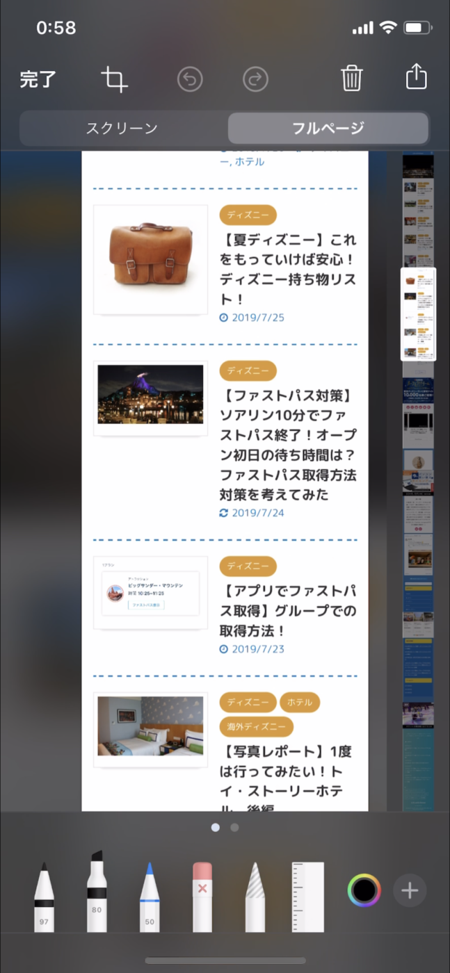 今まではPDFを作るというボタンがメニューにありましたが、iOS13からはスクリーンショットを行った際の画面から「スクリーン」もしくは「フルページ」の選択が可能です。フルページは保存形式は以前と変わらずPDF形式で保存場所を選択することができます。このPDFはLINEなどでも送ることができます。